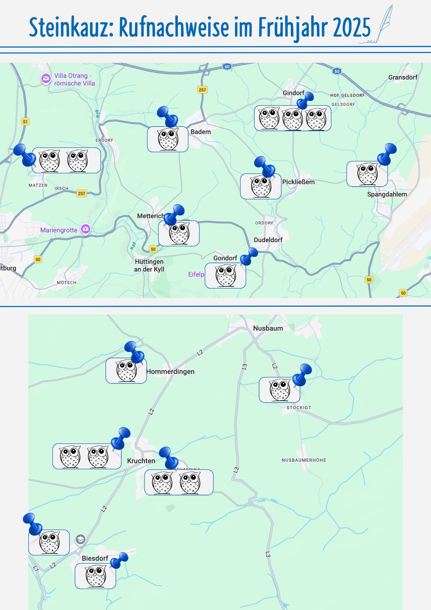 Unter dem nachstehenden Link findet Ihr die von Michael Hahn ausführlich dokumentierten Ergebnisse der Steinkauz-Beobachtungen im Eifelkreis und an anderen Standorten in Rheinland-Pfalz.
